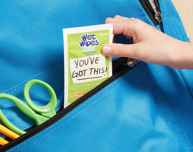 Saatke oma lapse lõunaboksi, seljakoti, spordisaali jne. Meie uute Wet Wapes Single'iga, lõbusate ümbristega salvrätikutega! Lastele inspireerituna ja nende jaoks mõeldud antibakteriaalsetest salvrätikutest on spetsiaalne kirjutatav ümbris, kus saate oma sõnumi kirjutada, et saaksite oma lapsele toredat päeva soovida (või meelde tuletada, et nad enne lõunat kätt pesta). Märjad salvrätikud vallaliste laste antibakteriaalsetel salvrätikutel on lõbus, värske, puuviljane lõhn, mida lapsed armastavad, ja seal pole kleepuvat jääke, mida nad ei tee! Nagu kleepuv jääk. Vanemad armastavad meie käte desinfitseerimisperioodi, sest nad tapavad võimsalt mikroobe ja on nahal õrnad. Märg salvrätikud singlid on hüpoallergeenne, lastearsti testitud ja Tymomuse kaubamärk #1!